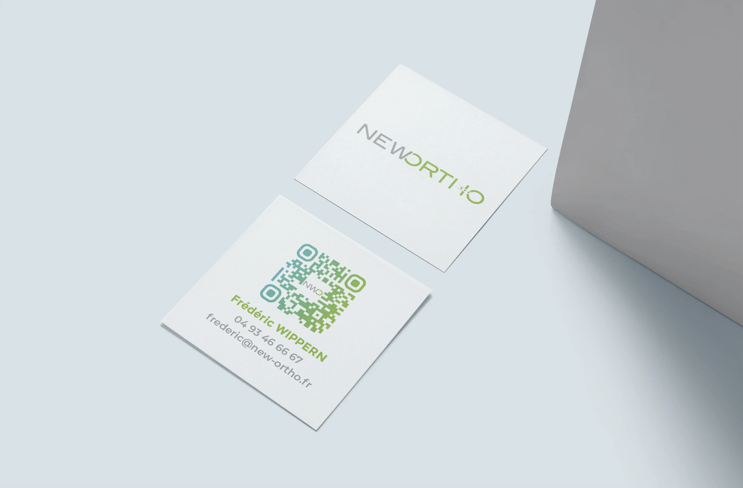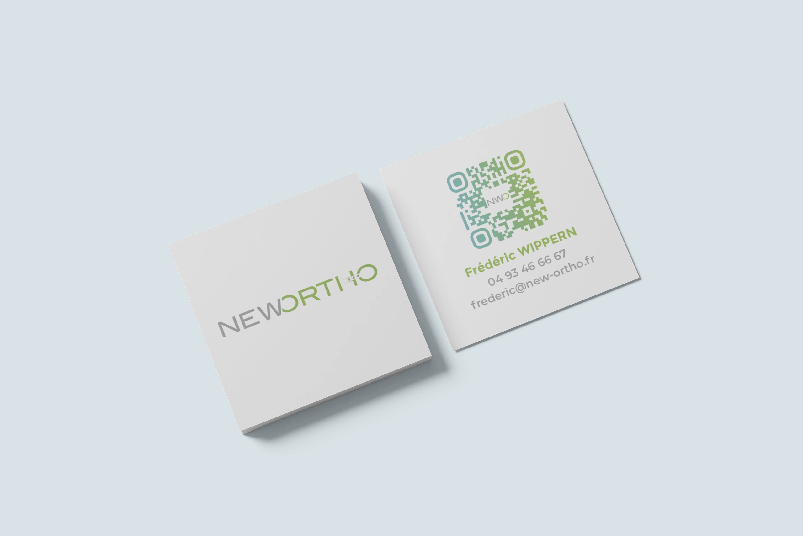 Carte de visite au format carré pour tous les membres de l'équipe. Mise en place d'un QR Code pour accéder au site internet de l'entreprise.