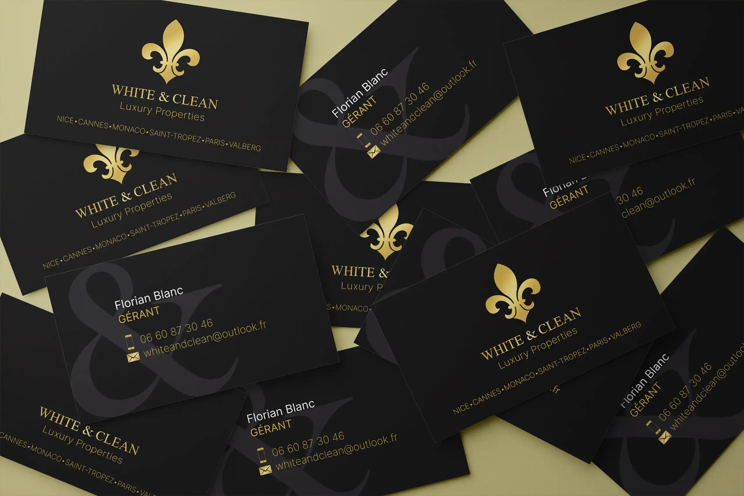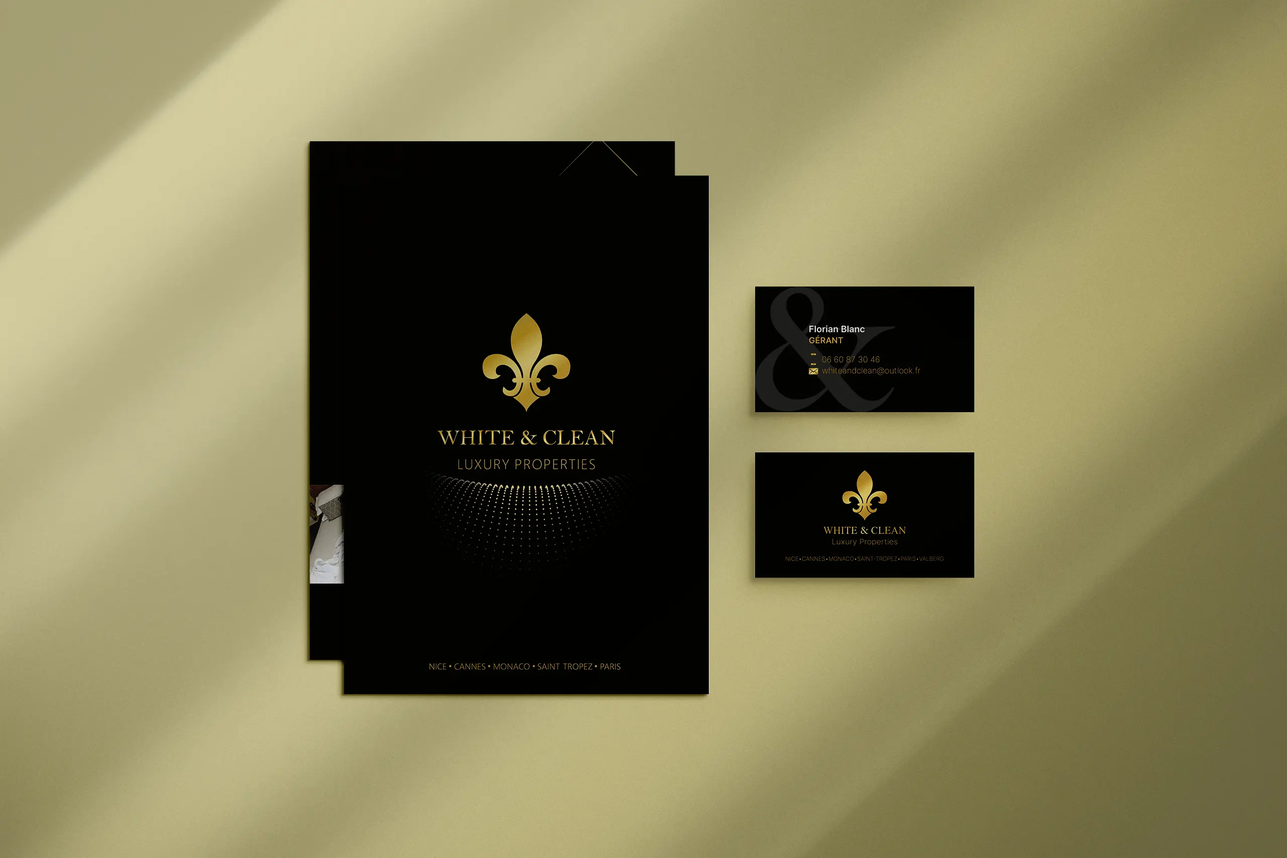 Création Mise en page d'un flyer A5 recto/verso et d'une carte de visite, en accord avec l'identité visuelle épurée et prestigieuse de l'entreprise.